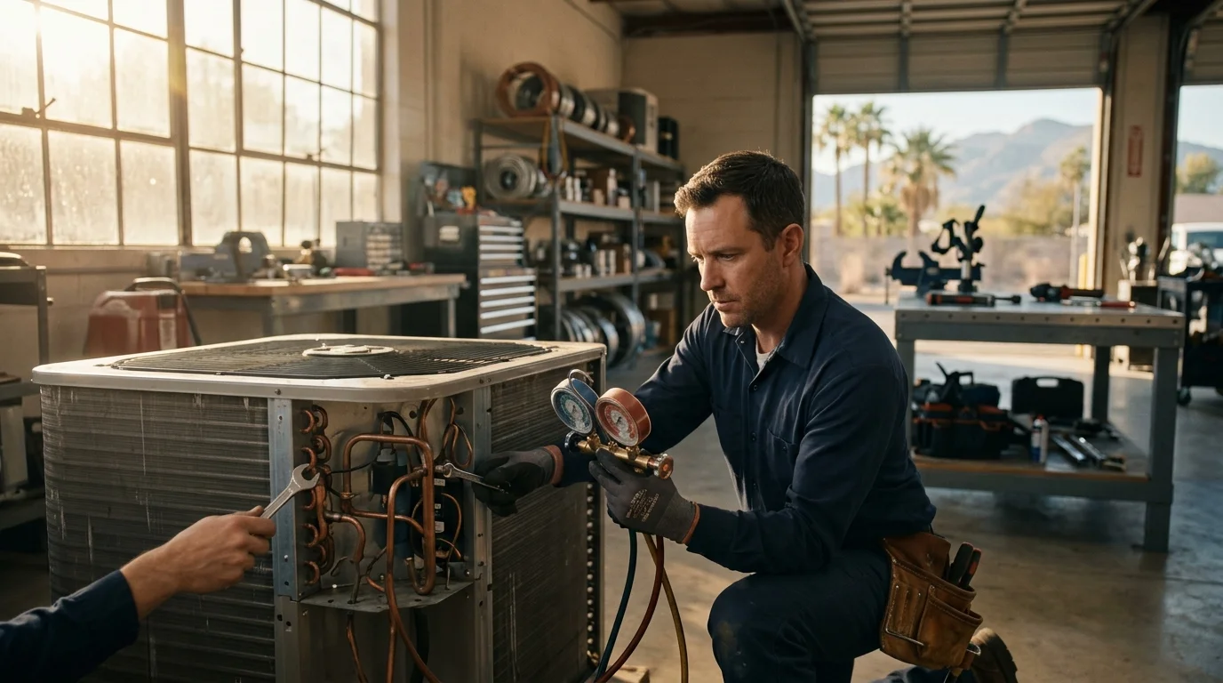 Check if they offer a specialized 'Desert Maintenance' plan that includes coil cleaning specifically designed to remove alkaline dust.